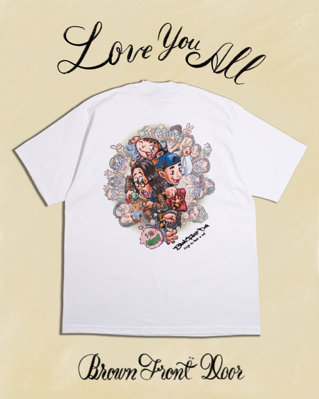 1주년 브라운 프론트 공간에 사람이 북적이는 것을 표현했습니다. 주가 되는 아트웍 배경엔 민트색 색을 설정하여 마치 파이어킹 D Handle 안에 있는 것으로 연상되는 것을 의도했습니다. 티셔츠 전면부는 래터링 및 그래픽을 넣지 않았습니다. 제품의 기반이 되는 티셔츠는 '프로클럽' 사의 제품을 이용했습니다. 넥라인이 탄탄하고 좁은게 특징이며, 잦은 세탁에도 타 솔리드 티셔츠 브랜드에 비해 목 늘어남이 현저하게 적은게 특징입니다. 티셔츠 전면부는 그래픽이 없습니다. 제작 시 의도한 것으로 브라운 프론트 도어 공간 특성을 살려 방문 시 들고 오시면, 핸드스티치로 자그마한 꽃 디테일 또는 체인스티치 자수로 이니셜, 단어, 짧은 문장으로 앞부분을 채워드립니다.