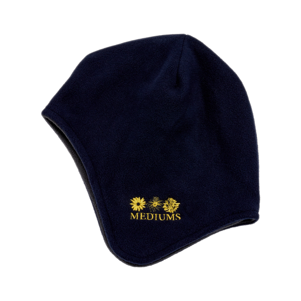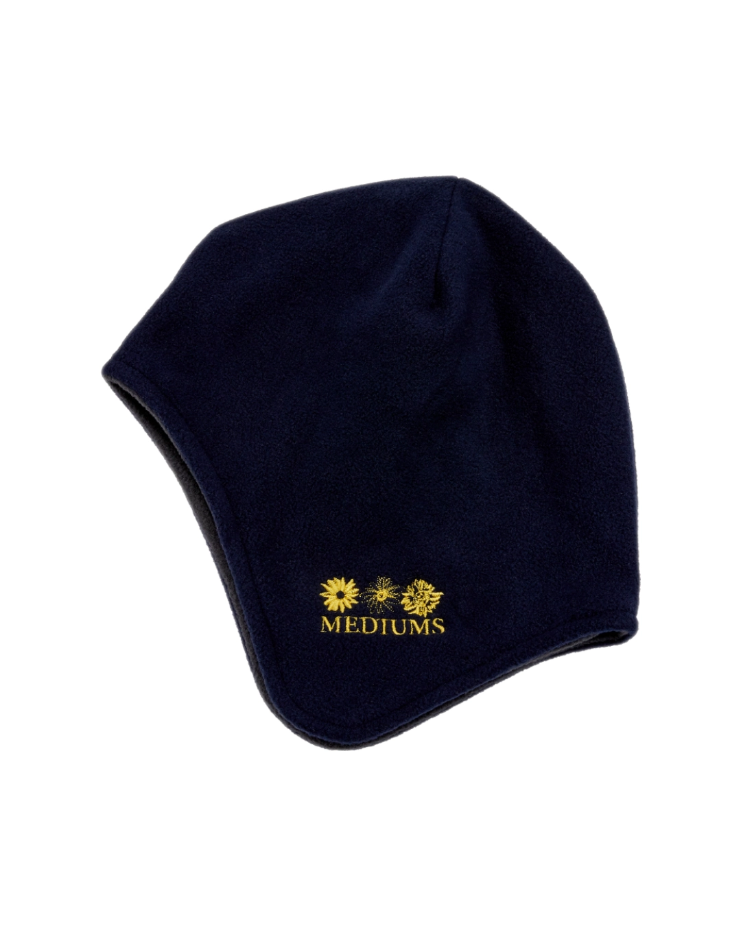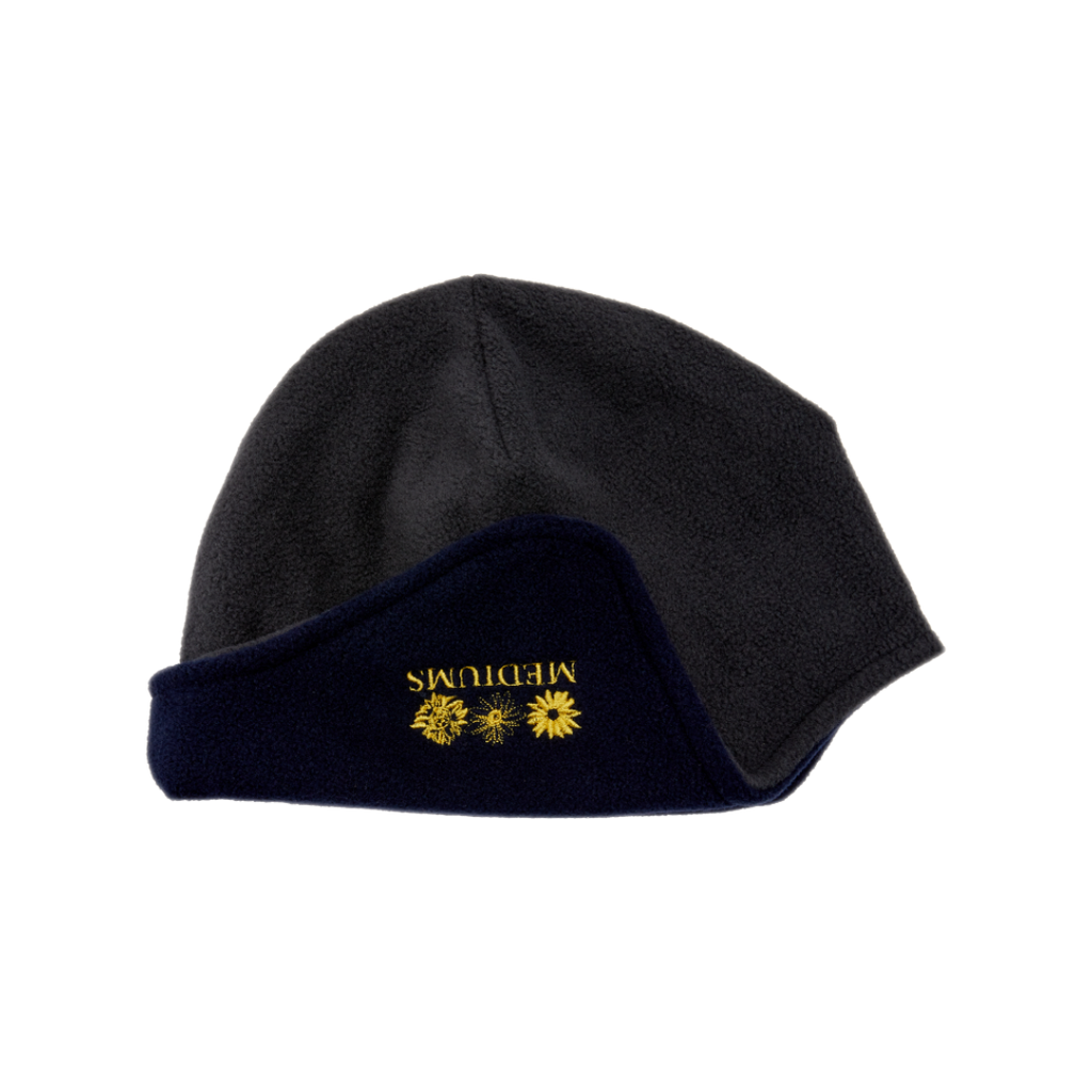 미디엄스 해바라기 자수 로고가 새겨진 이어플랩 플리스 비니입니다. 리버서블 제품으로 취향에 따라 뒤집어서 착용할 수 있습니다.
